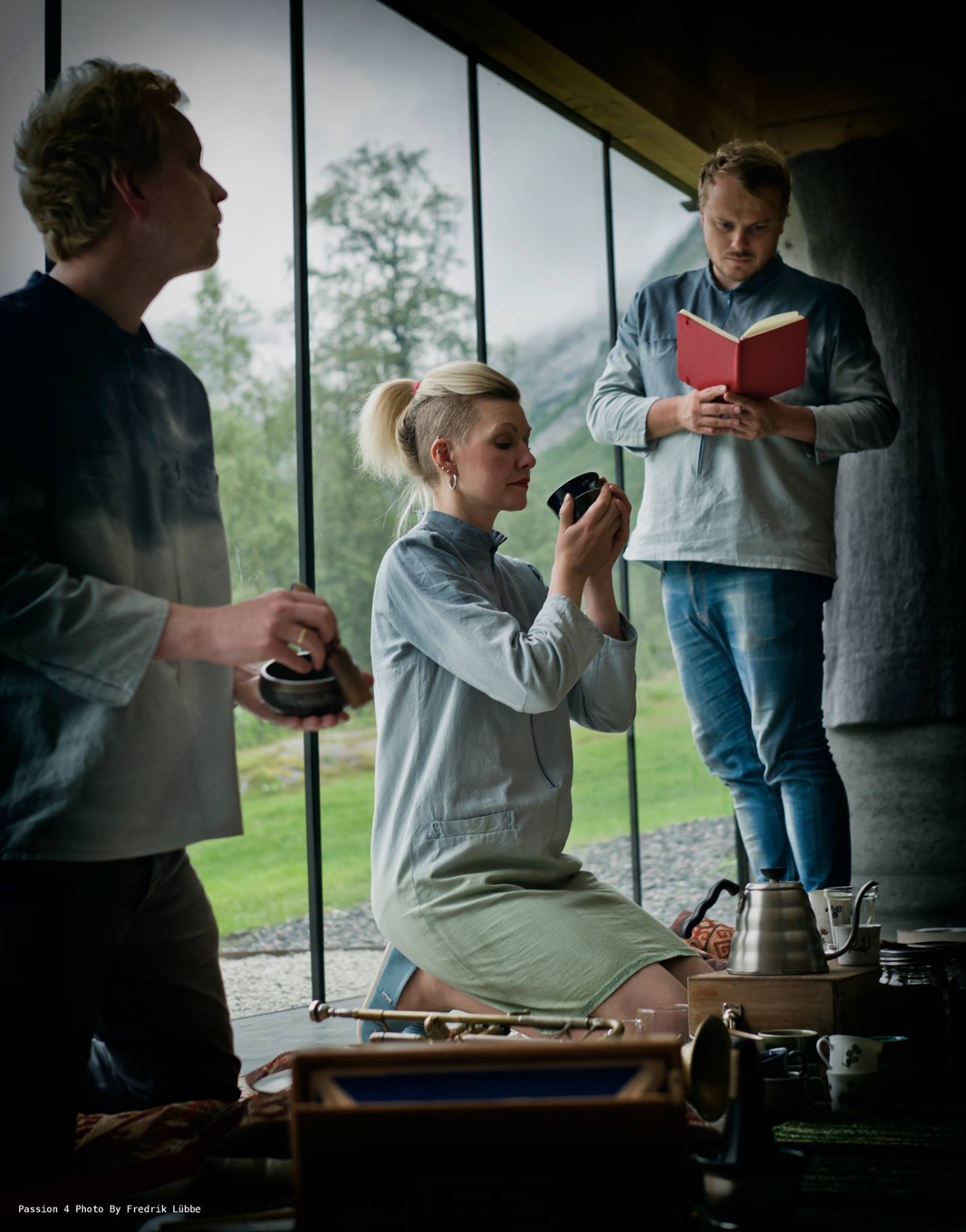 Karin lager egenplukket krekling-te og serverer i egenpruduserte unike porselenkopper. Endre leser egne og modernistiske Haiku-dikt fra boken, "Noriaki" (Flamme Forlag, 2017). Stian binder det hele sammen med sitt lydlandskap med myk trompet og div asiatiske instrumenter.